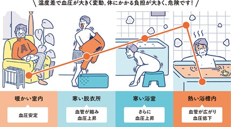 ヒートショックは冬場に暖房の効いたリビングから脱衣所に移動し、浴槽に入るときなどに起こります。リビングから脱衣所に移動した際には、寒さに対応するために血圧が上昇します。そこで衣服を脱ぎ、浴室へ入るとさらに血圧は上昇します。その後、浴槽に入ると、急に身体が温まるため、血圧が下降します。特に10℃以上の温度差がある場所は危険とされており、注意が必要です。